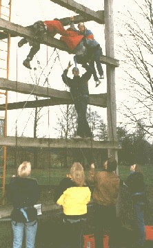 Es dürfen als Hilfsmittel nur die vier Querbalken und die anderen Kletterer verwendet werden. Emporziehen am Seil oder an den senkrechten Außenbalken etc. ist unzulässig.Die Gruppe muß dabei beachten, daß alle vier Personen die obere Plattform erreichen. D.h., die Kletterer müssen in einer längeren der eigentlichen Kletteraktion vorausgehenden Planungsphase diskutieren und absprechen, an welchen Stellen welche Personen, in welcher Reihenfolge und auf welche Art und Weise (Räuberleiter, Hochspringen, Hochziehen etc.) sie nach oben steigen möchten. |